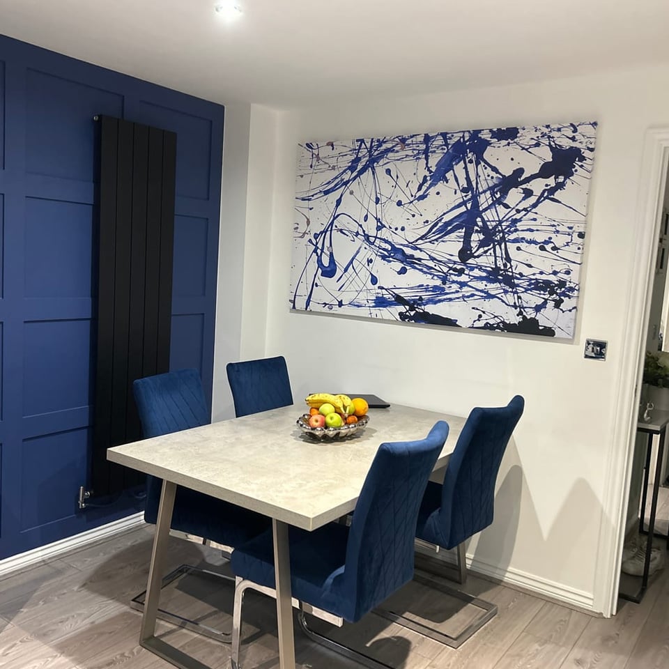 This abstract canvas print features a paint spatter design that is a great piece of art if you're looking for something contemporary and a little bit different to decorate your home with. This design has been created using inky blue paint splashes on a plain white background. Printed on high quality canvas and available in a range of sizes