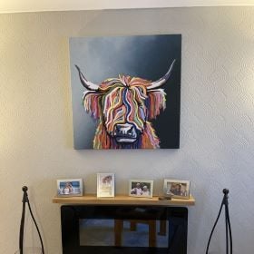 Need a statement piece of wall art that is both striking and colourful? If you love animals then the is modern take on the magnificent Highland Coo as a high grade canvas is the one for you. This square art canvas draws the eye in any room with it uplifting colourful design.
